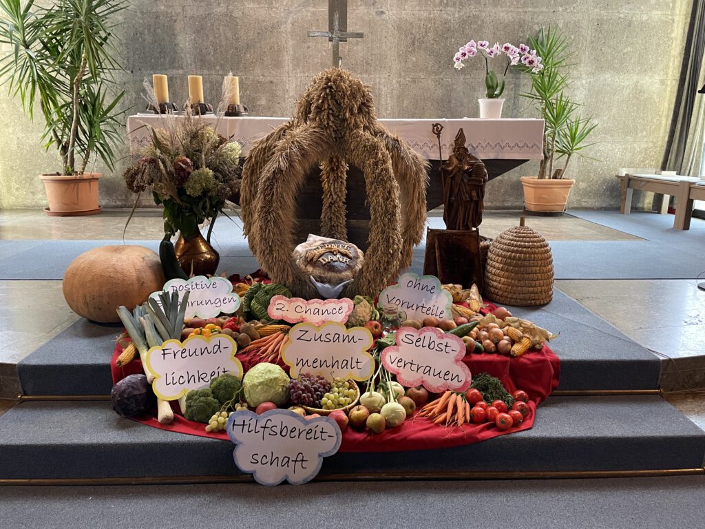 „You’re welcome!“ hieß es im Anschluss für die Mittelschülerinnen und Mittelschüler. You’re welcome – das heißt nicht nur, willkommen sein. Es bedeutet so viel wie „Gern geschehen“. Es ist die Antwort auf das Danken! Wie schön ist es, wenn Wertschätzung erfahrbar wird, wenn eine Atmosphäre der Dankbarkeit und des Willkommenseins herrscht – auch in der Schulfamilie. Nicht selten stehen Schüler*innen und auch Lehrer*innen im Schulalltag vor Situationen, in denen es knifflig wird. Wie die Grundhaltung der Dankbarkeit und vor allem der Wertschätzung ebendieser in verschiedensten Situationen des Schulalltags gelebt werden kann, präsentierten einige Mittelschüler anschaulich. So wurde der herrliche, mit Feldfrüchten gestaltete Erntedankaltar ergänzt durch ganz neue Früchte aus dem Alltag eines Schülers oder Lehrers. Mögen diese Früchte reifen und das begonnene Schuljahr bereichern!