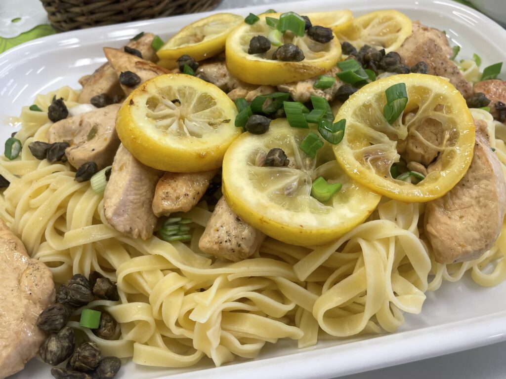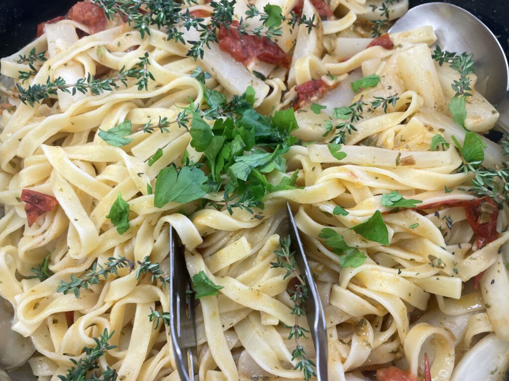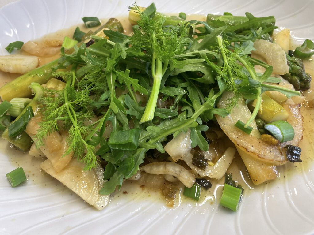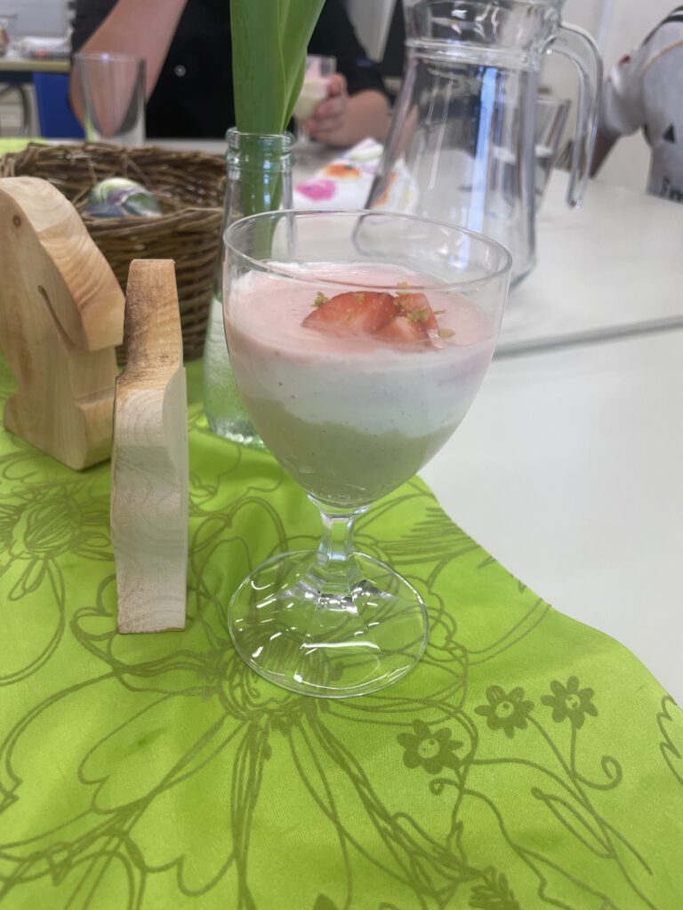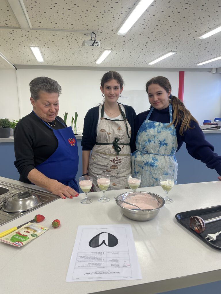 Mit viel Begeisterung und Engagement wurden verschiedene Gerichte zubereitet: ein frischer Spargel-Fenchelsalat, Mairübchen mit Kirschtomaten auf Pasta, Zitronenschnitzelchen auf Pasta sowie ein dreifarbiges Dessert mit Pistazien und Erdbeeren – passend zu den Farben der italienischen Flagge.